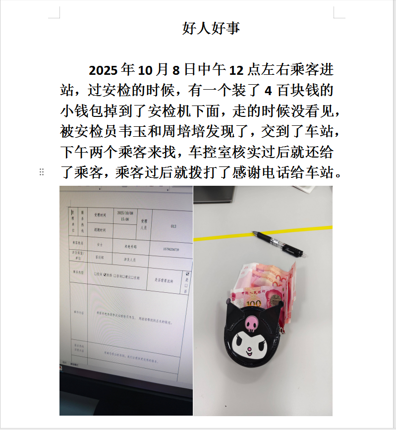 10月8日中午,古彭广场地铁站安检员韦玉和周培培在执行任务时,敏锐发现有乘客将装有400元现金的钱包遗失在安检机下。两人立即拾起并上交站务人员妥善保管。后失主返回寻找,经核实无误后物归原主。失主深受感动,特意致电站务,对两位安检员拾金不昧的高尚品德表示衷心感谢。