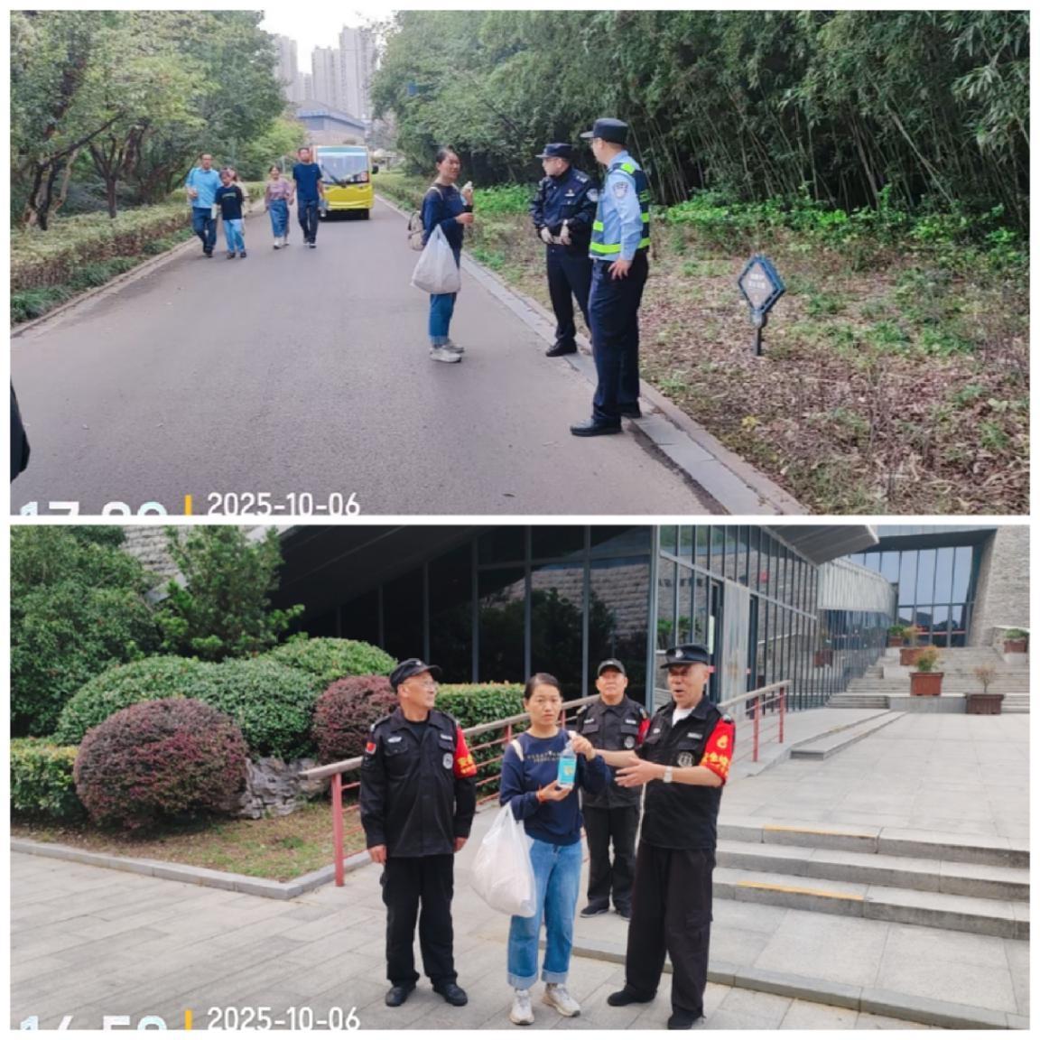 10月6日上午,楚王陵风景区游客摩肩接踵。保安中队长许伟带队巡逻时,接到一位女士紧急求助,称其患有精神疾病的妹妹走失且电话无法接通。许伟队长沉着应对,一边安抚家属情绪,安排其在岗亭等候,一边迅速通过对讲机通报全体队员协查。找到走失者时,其情绪已显不稳,队员立即采取伴随保护措施,并第一时间联系警方。最终在辖区派出所民警的协助下,姐妹得以平安团聚离园。