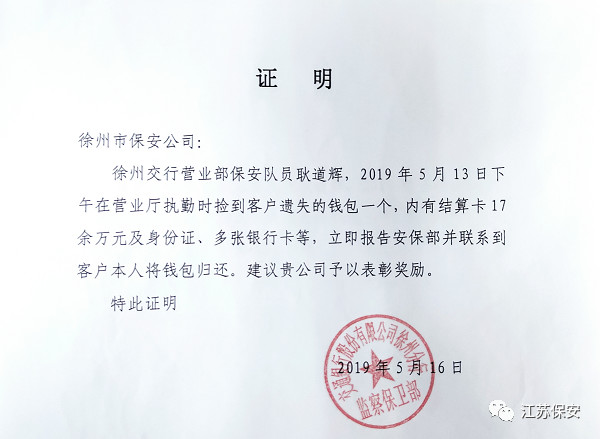 2019年5月13日,徐州市保安公司驻交通银行股份有限公司徐州营业部保安员耿道辉执勤期间,在营业大厅捡到1个钱包,内有结算卡17万余元及身份证、银行卡、现金等。耿道辉第一时间报告安保部,根据相关信息联系失主、及时归还。后银行和公司分别对耿道辉进行了表彰奖励。
